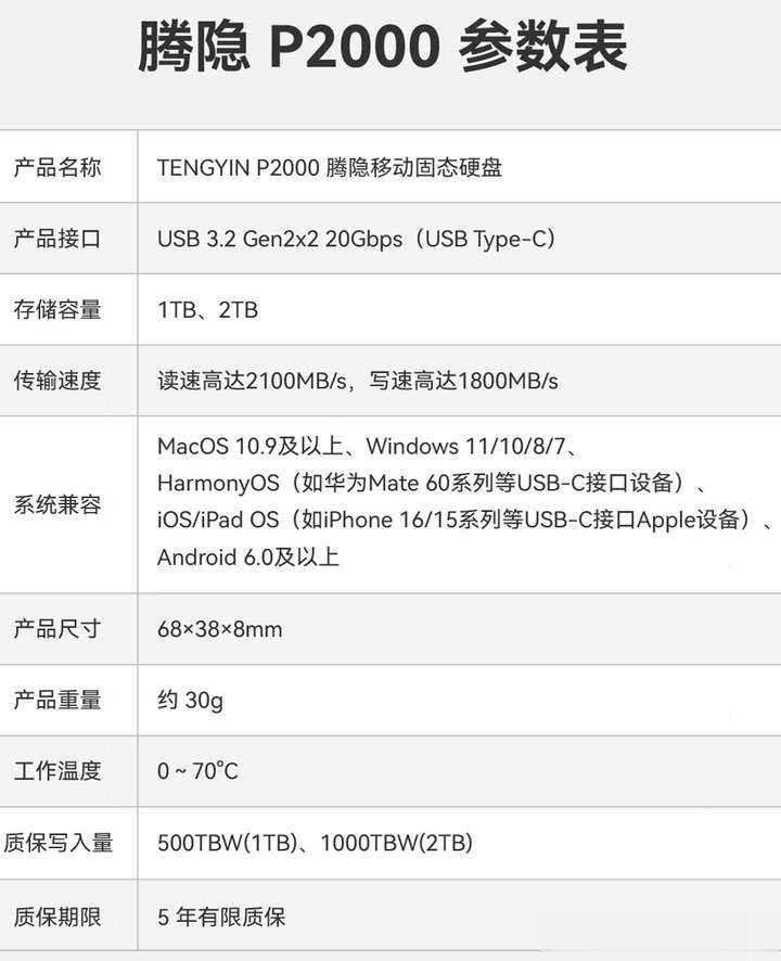 在品质方面,腾隐P2000采用高品质存储颗粒,历经多重严苛测试,全面质量体系标准,品质可靠更有五年质保,让摄影师无需担心数据丢失问题。
