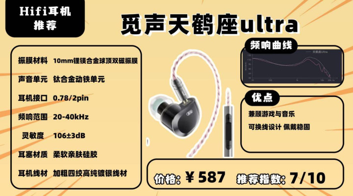 耳机采用复合单元结构,动圈与动铁组合,三频分布相对均衡,细节表现清楚。搭配随机附带的“星云”外置声卡使用时,内置 DSP 和虚拟 7.1 环绕能明显拉开声场,在游戏中对脚步声、枪声的方向判断比较直观,对竞技类游戏帮助明显。用来听歌时,解析和定位感偏强,但声音取向更偏向电竞风格,在部分音乐上听感不算柔和,属于取向明确的调校。