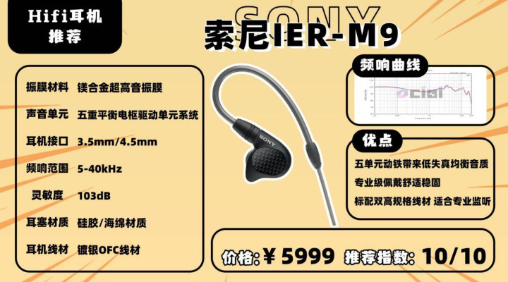 耳机采用索尼自研五动铁结构,其中包含镁合金振膜的超高频单元,整体失真控制出色,频响覆盖全面。实际听感非常均衡,三频分布平直,低频量感充足但不夸张,中频干净,人声结像清晰,高频延伸自然,没有刻意的刺激感。这种调音能忠实呈现录音细节,但情绪渲染较少,声音偏理性,听感略显冷静。对喜欢强烈低频冲击或明亮高频的用户来说,可能会觉得风格偏淡。