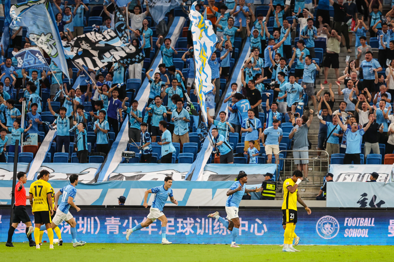 新华社照片,深圳(广东),2025年9月28日\n 9月28日,深圳新鹏城队球员韦斯利(右二)在比赛中庆祝进球。\n 当日,在广东深圳举行的2025赛季中国足球超级联赛第26轮比赛中,青岛西海岸队客场2比1战胜深圳新鹏城队。\n 新华社发(彭志刚摄)